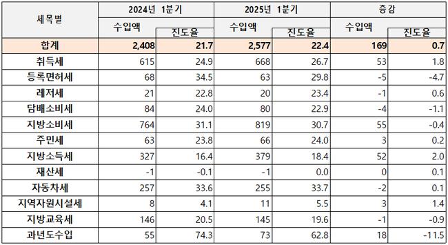 2025년 1분기 지방세 수입 25조 8천억 원…전년 대비 1.7조 증가 - 지방소득세·취득세 모두 상승…지방소비세는 진도율 소폭 하락 - 전체 예산 대비 수입 진도율 22.4%, 전년보다 0.7%p 상승