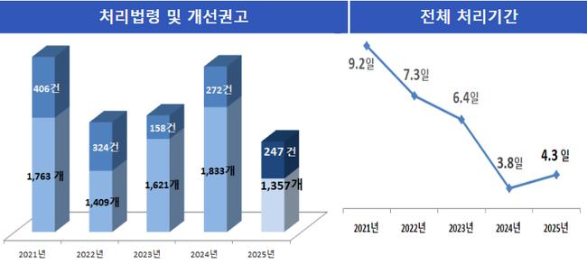 분야별로는 환경·보건 분야가 27.9%로 가장 높은 비중을 차지했다. 34개 법령을 대상으로 69건의 개선 권고가 이뤄졌으며, 산업·개발 분야는 26개 법령에서 47건(21.3%), 국방·보훈 분야는 20개 법령에서 47건(16.4%)이 권고됐다. 신산업 개발과 지원, 공공관리 영역의 법령에서 개선 필요성이 집중된 셈이다.