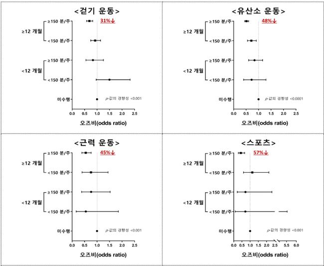 [그림] 각 운동 유형별 수행 시간 및 기간에 따른 우울증 위험에 대한 오즈비
