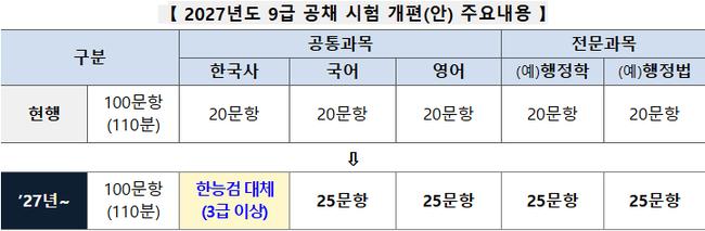 개편안에 따르면, 9급 공채 시험은 기존 국어, 영어, 한국사 공통과목과 두 개의 전문과목으로 구성되었으나, 2027년부터는 한국사가 한능검(3급 이상)으로 대체되고 국어, 영어, 그리고 두 개의 전문과목이 각각 25문항씩 출제된다. 총 문항수는 100문항으로 동일하며, 시험 시간도 110분으로 유지된다.