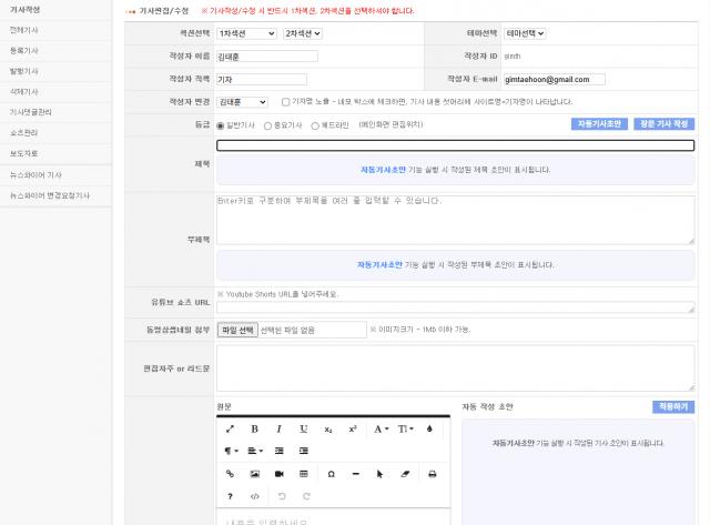 `AI수습기자` CMS 적용 화면. 기사 작성 및 송고 시스템 내에서 AI수습기자를 활용해 기사 초안을 만들고 송고할 수 있다