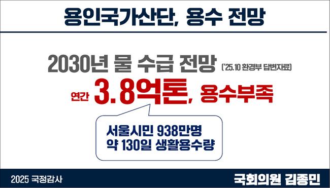 마지막으로 김 의원은 “첨단전략산업위원회를 소집해 용인 산단을 전면 재검토해야 한다”며 “전력, 용수, RE100의 실현 가능성을 기준으로 사업을 재평가·재심의해야 한다”고 산업부 장관에게 촉구했다.