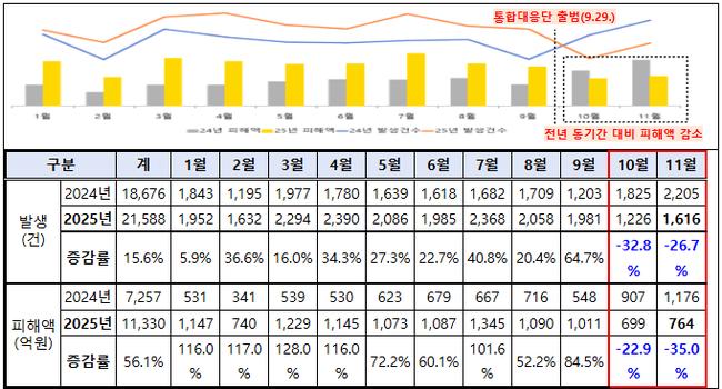 범정부 통합대응단 출범 2개월… 보이스피싱 발생·피해액 모두 감소세 전환 - 10~11월 발생 건수 26.7%↓, 피해액 35.0%↓… 전년 대비 뚜렷한 하락 - 24시간 신고대응·실시간 차단 강화·국제공조 확대 효과 - 캄보디아·태국과 합동작전… 해외 조직원 90여 명 검거