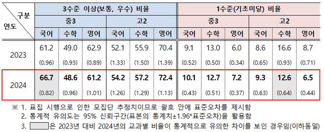 평가 결과, 중학교 3학년 국어에서 3수준(보통학력) 이상 비율이 전년 대비 5.5%포인트 상승한 66.7%로 나타나 통계적으로 유의미한 향상을 기록했다. 반면 고등학교 2학년 수학에서는 1수준(기초학력 미달) 비율이 16.6%에서 12.6%로 4.0%포인트 감소해 기초학력 저하 문제가 다소 개선된 것으로 나타났다.