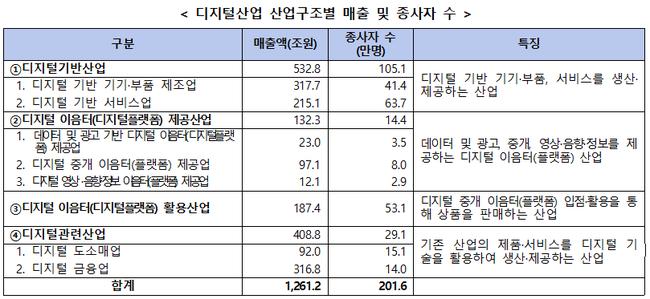 중분류 기준으로는 디지털 기반 기기·부품 제조업(317.7조 원), 디지털 금융업(316.8조 원), 디지털 기반 서비스업(215.1조 원)이 상위를 차지했다.