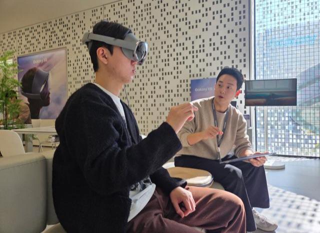삼성스토어 홍대에서 헤드셋 형태의 모바일 기기 `갤럭시 XR`을 체험하는 모습